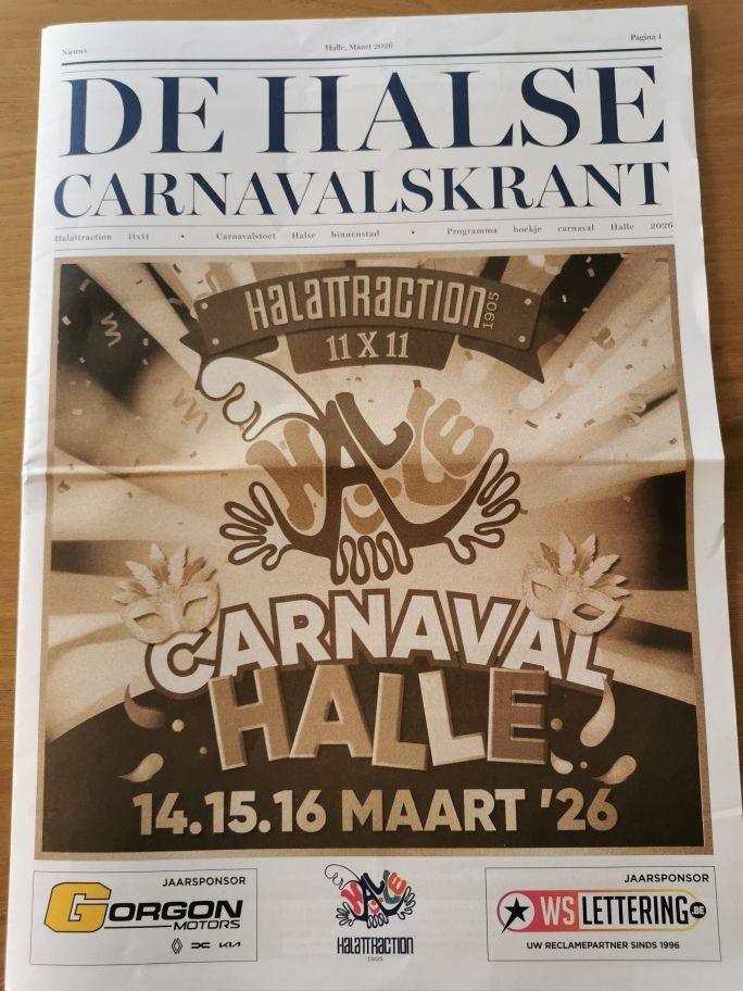 We zitten in de laatste rechte lijn naar ons carnavalsweekend op 14-15-16 maart 2026. Het carnavalskrantje werd vorige week verdeeld in de brievenbussen van Groot-Halle. Via deze link vinden jullie alle nodige informatie terug over de geschiedenis van Carnaval, Programma, Parcours, praktische info Carnavalskrant